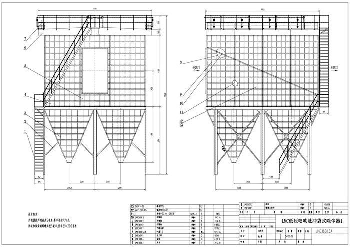 (1)鑄造廠電爐布袋除塵器 結構 點 除塵器中部箱體為園形筒狀結構,設計壓力0.25MPa,材質為Q345R,板厚14mm以上。其上設: 檢修人孔。 箱體設氮氣吹掃系統,用于qingchu積聚的灰塵和筒體煤氣置換吹掃; 高爐布袋除塵器 高爐布袋除塵器(2張) 儀表壓縮空氣系統,用于閥門控制;設人工灰塵檢測口,方便取樣化驗。 懸掛式箱體支座。煤氣進口接管設相應導流配氣裝置。 高爐布袋除塵器頂部采用符合/T4746-2002標準要求的正橢圓形封頭,壁厚16mm以上,材質Q345R。凈煤氣從箱體頂部接出,在封頭上設有anquan閥及放散管。 高爐布袋除塵器下部采用錐形灰斗,材質Q345R,板厚14mm以上,錐形灰斗錐角為50°,確?;覊m順利排出。下錐體上設雙路蒸汽保溫盤管防止煤氣結露和粉塵結塊而影響排灰?;叶飞舷赂叩突椅桓髟O一個熱電阻檢測灰斗的灰位,并設有倉壁震動器兩套和氮氣吹掃管。 除塵器進、出口管道分別設置全封閉式電動插板閥、氣動三偏心蝶閥、大拉桿波紋補償器、手孔。